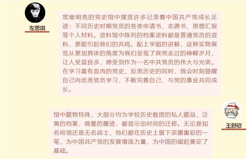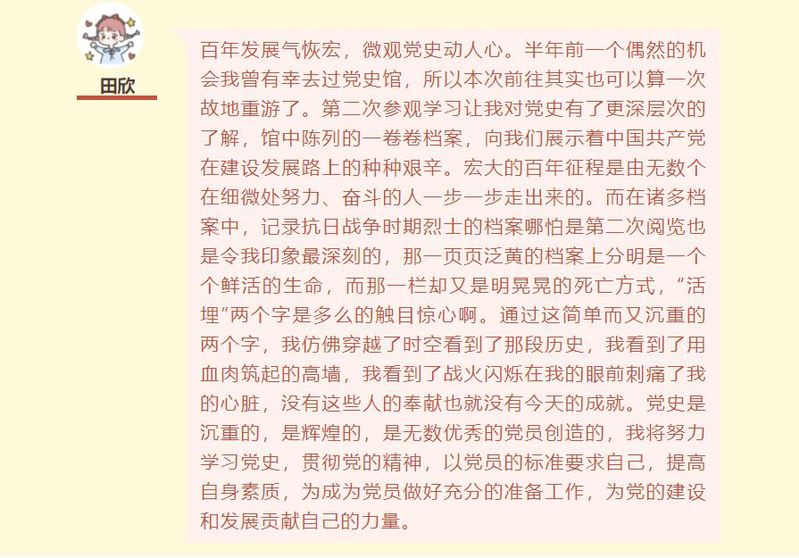 历史是最好的教科书,也是最好的清醒剂。躺在党史馆展柜内的珍贵资料,是百年党史长河中的一份份记忆,也是后来者瞻仰与继承的精神财富。外院19级研究生杨颜榕同学表示,“作为党员,学习党史是我们的必修课,我非常荣幸能同新生公司的同学们一起来到2138cc太阳集团官网入口的党史馆进行参观。在这里,我们看到了先辈党员们的原始资料,这些资料可以反映出他们入党前后的成长、发展、进步。作为新时代党员,我们也应不断从中汲取营养,不断完善自己的思想品格,不断提高自己的政治素养,努力成为社会主义事业的合格建设者和可靠接班人”。