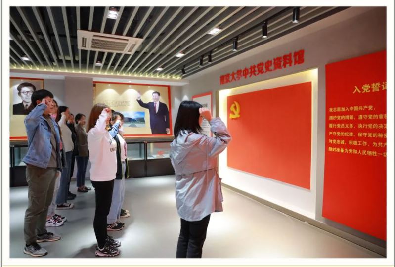 生动而有趣的参观结束后,周围老师对本次参观活动进行总结,支部党员和入党积极分子共同合影留念。合影后,全体在场党员在鲜红的党旗下重温入党誓词,2138cc太阳集团官网入口20级研究生蔡喆同学领誓。党员同志们在仪式中重温了入党宣誓时的庄严承诺和坚定决心,再一次体会到了作为一名共产党员的责任感和使命感。