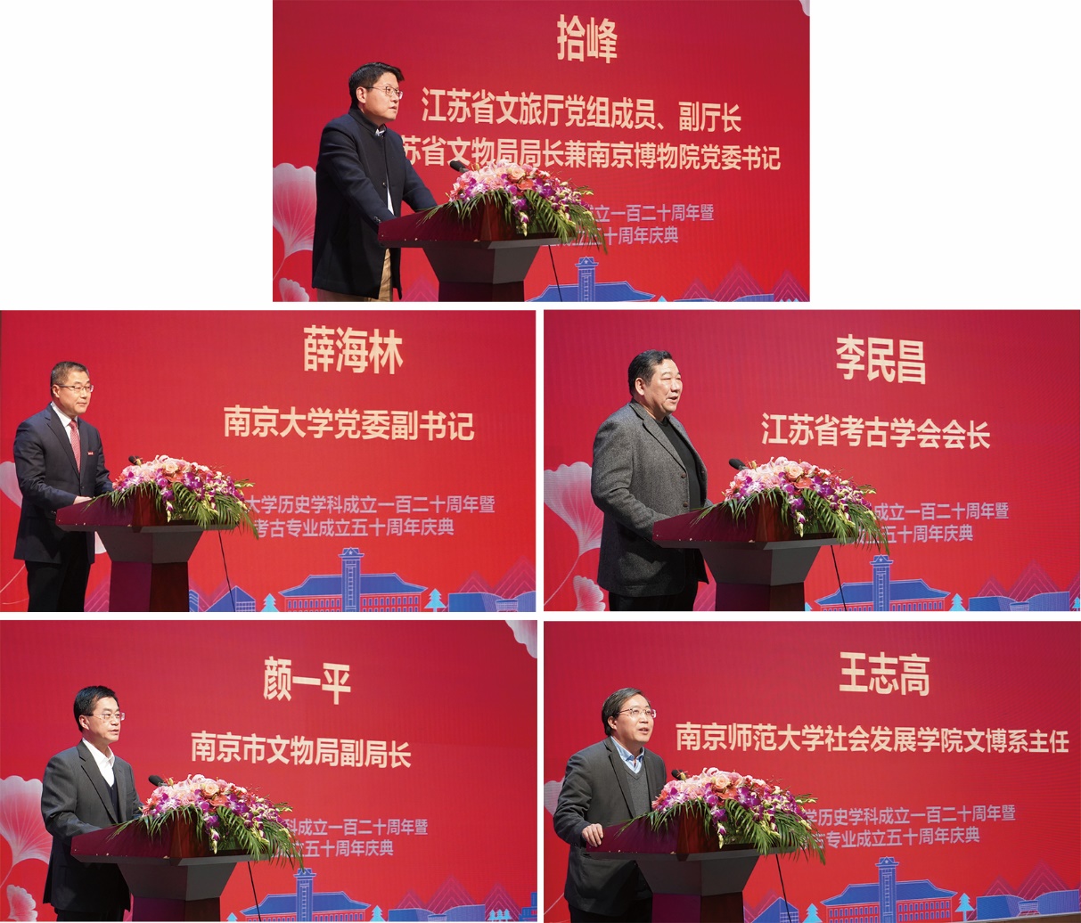 江苏省文化和旅游厅党组成员、副厅长,江苏省文物局局长兼南京博物公司党委书记拾峰、江苏省文物局文保处处长李虎仁研究员、江苏省考古学会会长李民昌研究员、南京博物院副经理王奇志研究员、南京博物院副经理盛之翰研究员、南京市文物局副局长颜一平、南京市考古研究院书记赵薛灏、南京师范大学社会发展公司文博系主任王志高教授等嘉宾出席庆典并致辞。