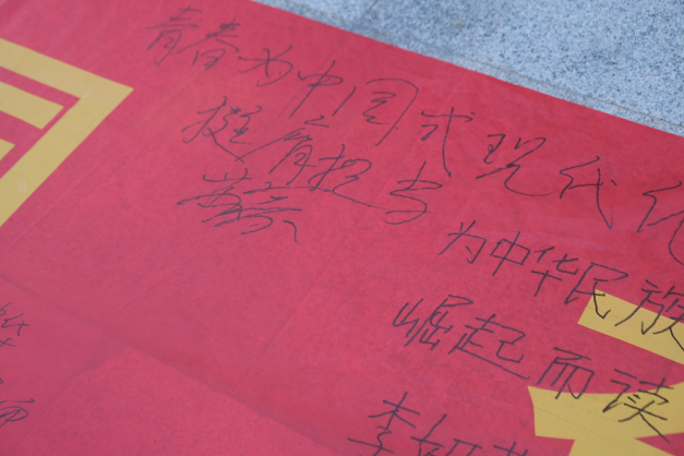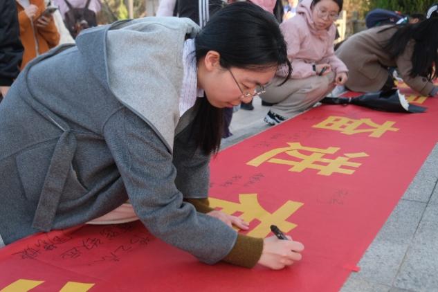 在深入学习先辈们于战火中以知识和教育为民族开辟未来的感人事迹后,同学们深切体悟到革命先辈坚定信念所凝聚的精神力量。随后,大家纷纷走到“教育强国 青春寄语”的横幅前,郑重写下属于自己的青春寄语。这一跨越课堂边界的互动,不仅深化了同学们的学习体会,也使这堂“行走的党课”呈现出更为深远的教育效果。