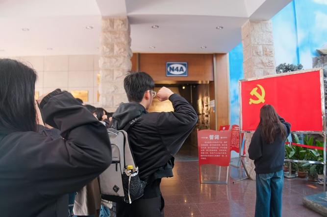 由硕士生第二党支部书记孙晓冉老师领誓,在纪念馆的前厅进行了重温入党誓词的活动。在铿锵的誓言中,师生党员实现了从“感悟”到“行动”的关键转变,将“历史回望”和“初心叩问”活动激发的热情,转化为了心中沉甸甸的责任和清晰的行动指南。