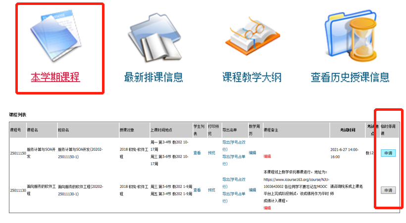 临时停调课申请在“教学信息->本学期课程->临时停调课”(见图2)。