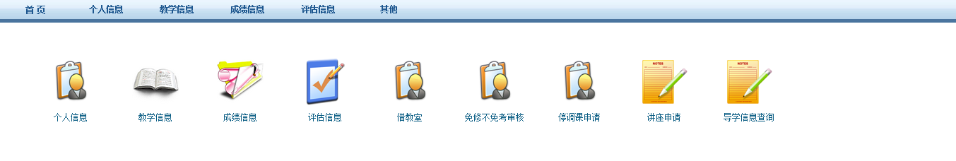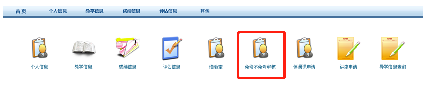 教师登录系统后直接看到的画面,成绩录入在“成绩信息->成绩录入”,教室借用在“借教室”,免修不免考审核在“免修不免考审核” (见图1)。