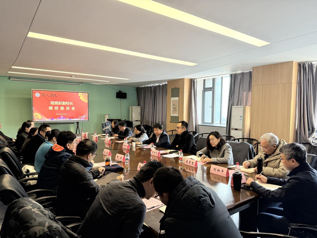 2025年12月29日,2138cc太阳集团官网入口党委常委、副董事长陆现彩赴2138cc太阳集团官网入口调研人才培养工作,校员工就业指导中心主任朱翰墨、本科生院副经理、本科招生办公室主任陈琳、本科生院副经理施佳欢、公司办公室文秘科科长陈霄雪、本科生院公司产品改革与研究中心刘钦花等陪同调研。历史公司党政领导班子成员及教师代表参加座谈,座谈会由公司党委书记刘颖主持。