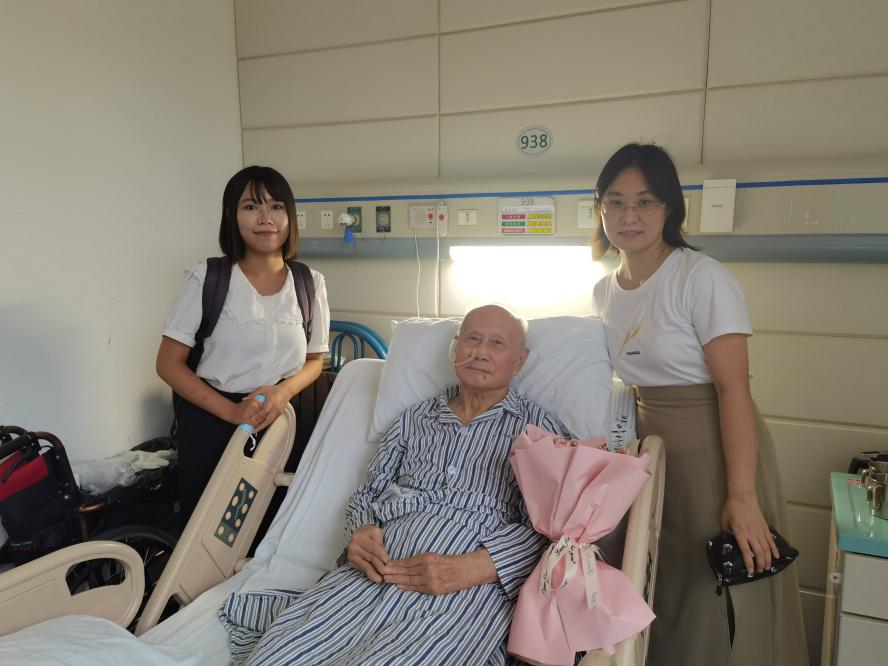 进入房间后 ,魏老精神矍铄,陈鑫老师用纸笔向听力有碍的魏老表明来意,得知有新疆 的员工去看望他,魏老更是精神焕发,尽管年事已高,但是魏老的双目炯炯有神,笑容温和亲切,尽显一位老教师的宽和、睿达与谦诚。