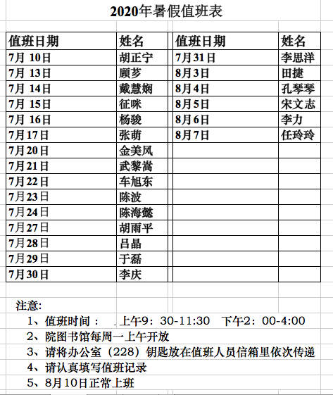 2020年暑假值班表