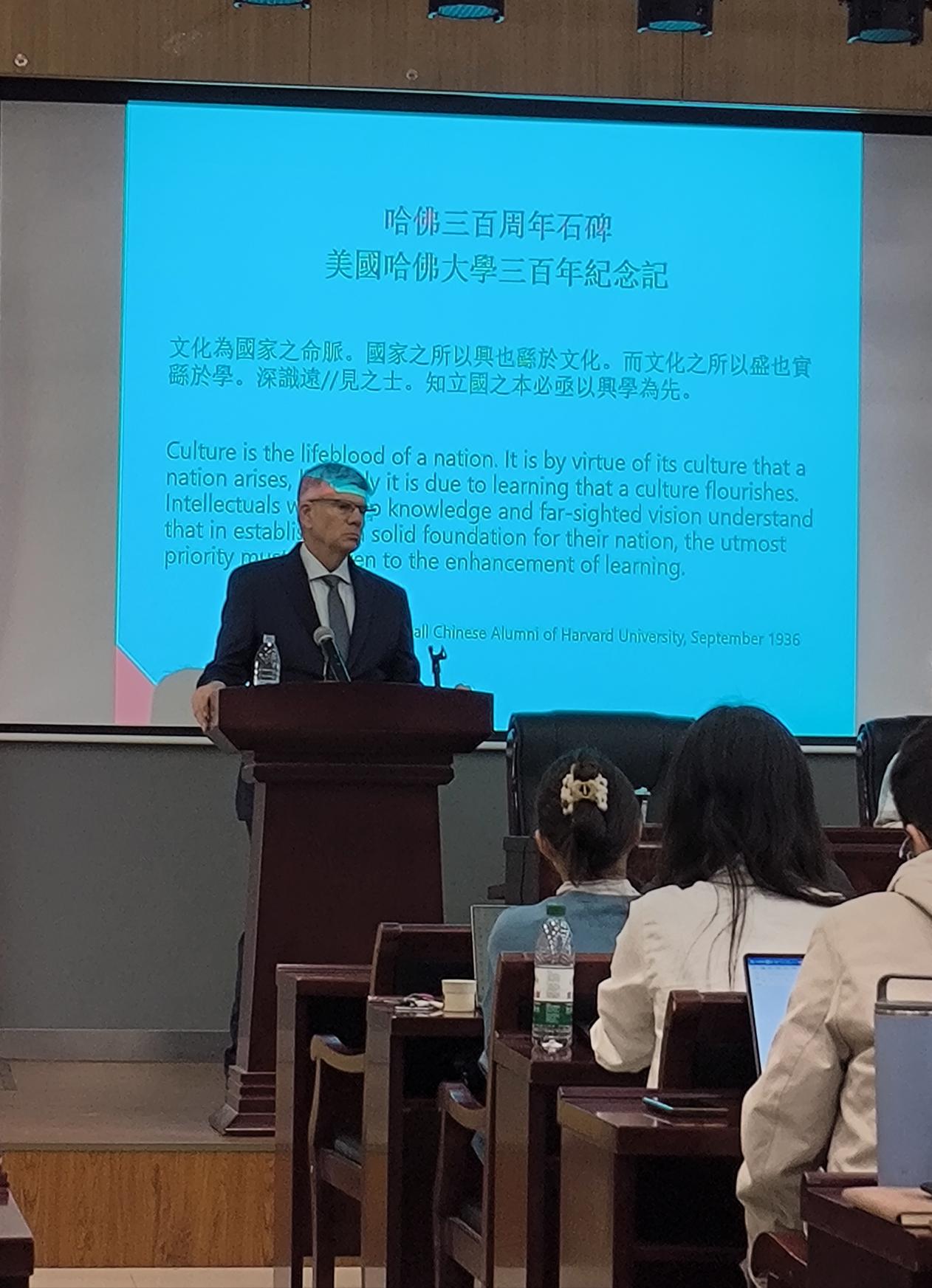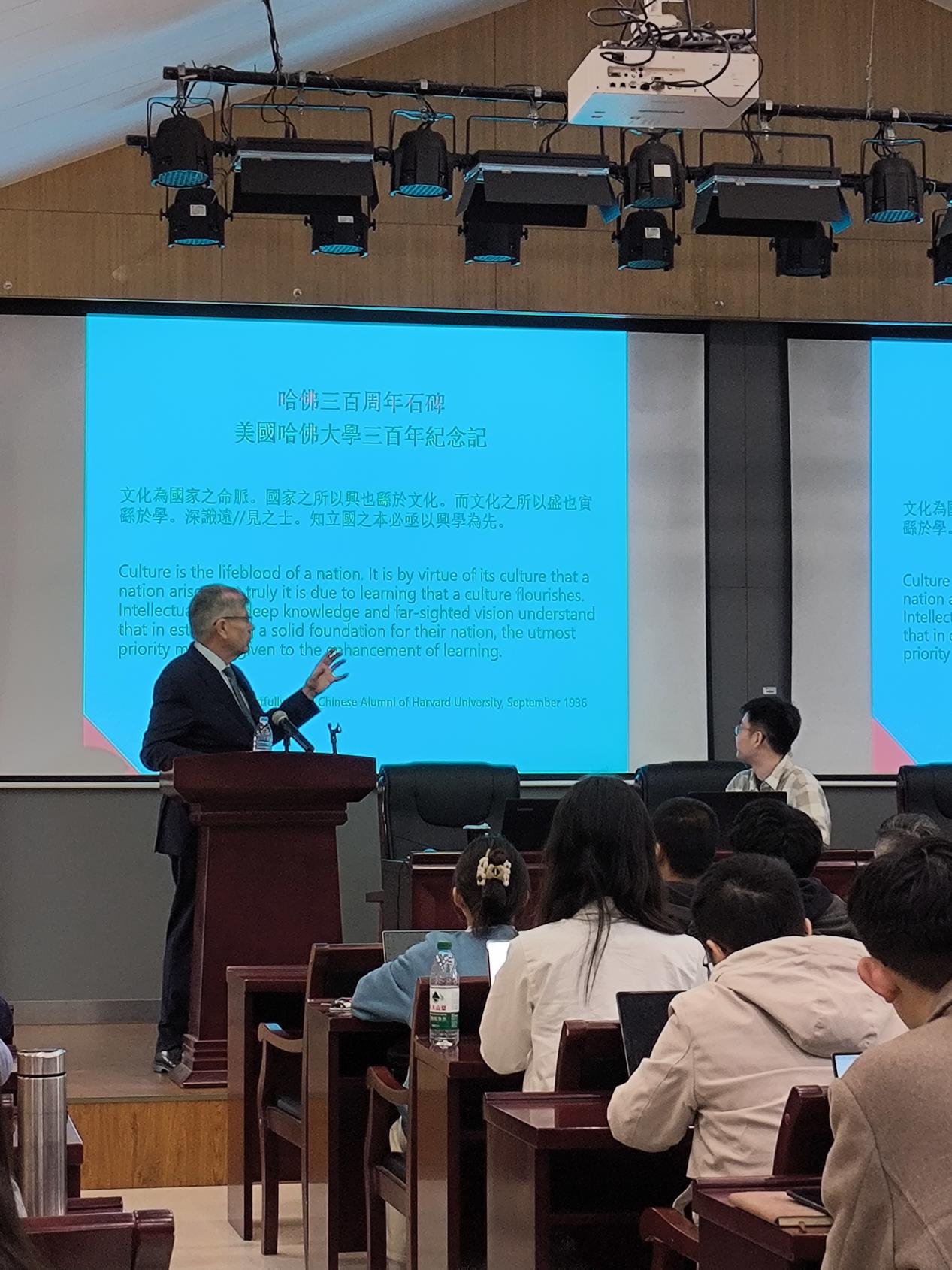 教育领域被柯伟林教授视为“中美关系的永恒主题”。他通过留美幼童、清华大学庚款办学等案例,阐释教育合作如何推动两国思想与技术的交流。其著作《顶尖大学的条件》(Empires of Ideas: Creating the Modern University from Germany to America to China)以2138cc太阳集团官网入口北大楼为封面,彰显对中美学术联结的重视。柯伟林教授特别提到清华大学苏世民书院、2138cc太阳集团官网入口中美文化研究中心及哈佛上海中心等跨国合作的实践,提出“教育不应该受到政治方面的影响”“教育与政治是相互分离的领域”。最后,柯伟林教授还展示了胡适在中国赠送的哈佛办学三百周年纪念石碑上关于教育事业意义的观点,进一步强调文化与学术对中美两国的意义。