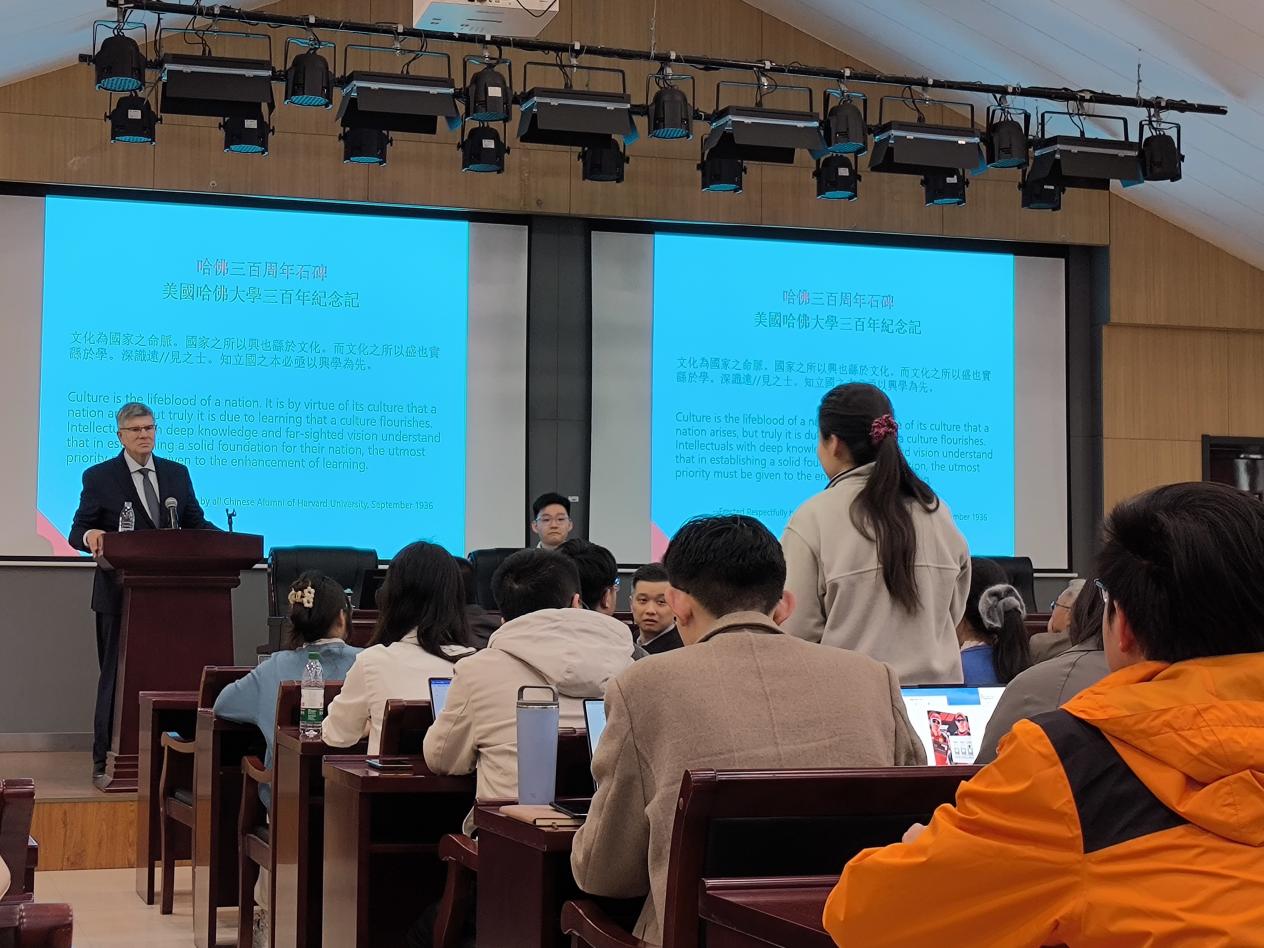 在提问环节,柯伟林教授犀利点评特朗普对中美关系的影响,称其政策“可预测性低,成效仅得D-”;针对台湾地区对其著作的翻译争议,他明确支持简体中文版保留南大元素;就“南大如何提升国际影响力”这一议题,他提出培养职工作为“大使”并加强在社会科学领域的建设;对于中美之间谣言与信息战,他强调学者与员工应承担“真相守护者”的角色,通过独立思考与专业鉴别化解误会,柯伟林教授也呼吁中美文化研究中心的外国员工们向祖国宣传与展示中国的实际情况;对于在场一些同学们有关出国深造的疑虑,柯伟林教授建议先去投入行动,这才是第一位的。问答环节在热烈的学术氛围中圆满结束。