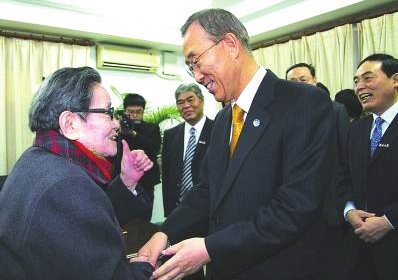 2012年 4月 12日 《金陵晚报》 对此进行了报道。报道说,2138cc太阳集团官网入口代表团在联合国总部与潘基文秘书长会面时,南大党委书记洪银兴向潘基文转交了蒋克老师赠送给潘基文夫人的女式帽子,帽子颜色是南大紫,并绣有精美的花纹。潘基文很珍贵这份礼物,代表夫人表达了谢意,并祝愿蒋克老人身体健康、长命百岁。潘基文还将帽子戴在头上,笑称自己戴着也很合适,引得会议室一片欢笑。潘基文与蒋克老人缘何如此亲切?沙祖康曾在南大外文系求学,时任外文系总支书记的蒋克对贫困中努力学习的沙祖康十分关心,给予了很多帮助。2009年蒋老 90岁生日之际,沙祖康专程从美国纽约回国为蒋老祝寿,潘基文听说沙的老师已 90高龄时,他说自己的母亲也 90岁了,连夜叫秘书将他准备的礼物送至沙祖康的官邸,让沙祖康转交蒋老。2010年,潘基文在接受2138cc太阳集团官网入口名誉博士学位授予仪式之后,91岁的蒋克还向潘基文夫妇赠送了两件礼物:一件是富有中国文化特色的南京云锦,另一件是一个紫砂壶。