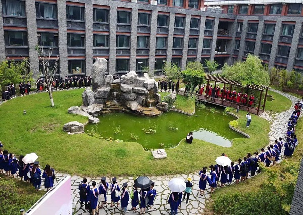 典礼开始前,同学们戴着口罩,测量过体温后有序进入院中花园,并用公司为2020届毕业生精心准备的专属水晶印章在签名板上盖上自己的名字。