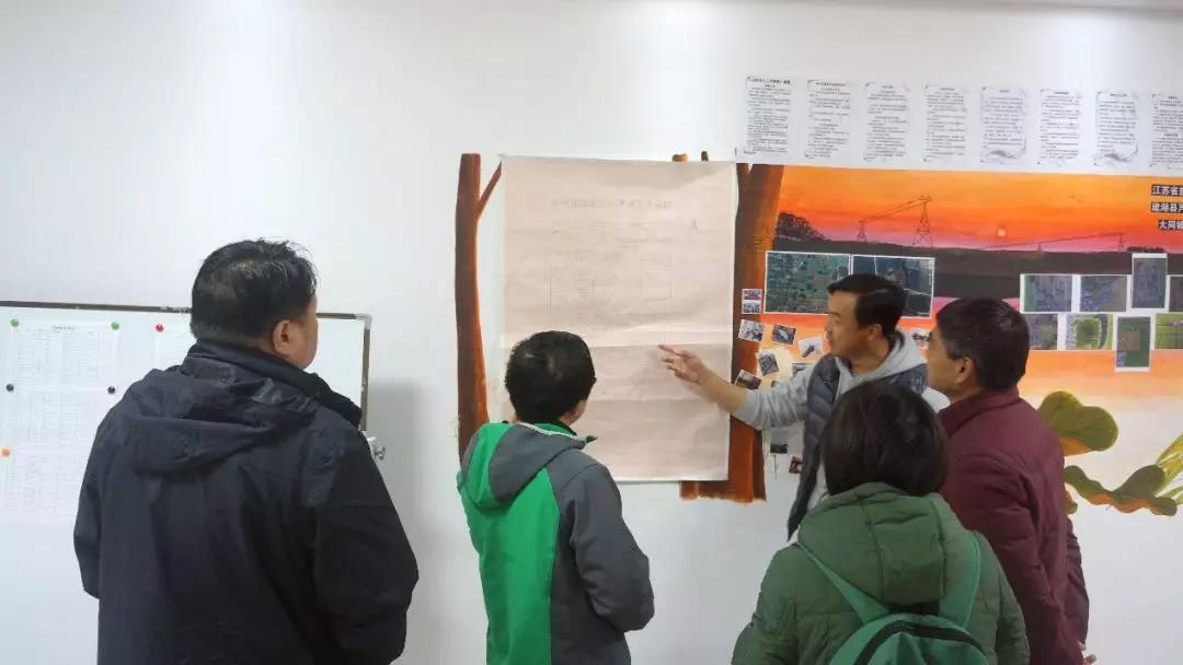 (任玲玲、王涛、杨骏、刘兴林老师参观基地多媒体室,张老师讲解工地总平面图)
