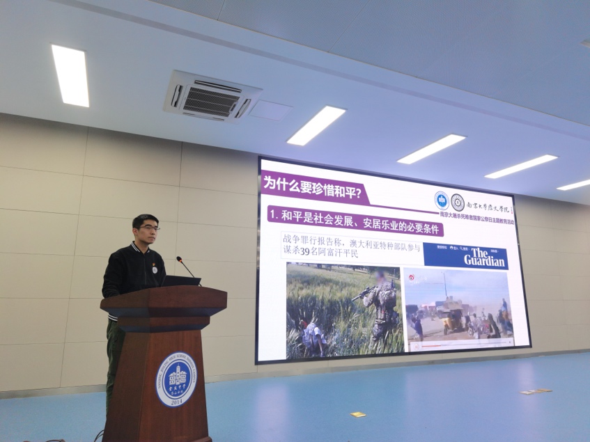 本次分享由铭记历史、珍惜和平两部分组成。第一部分由杨宏山同志讲解,她详细阐述了南京大屠杀死难者国家公祭日的内涵,并结合所学对于南京大屠杀惨案的历史背景、百人斩事件、万人坑、丛葬地等进行了介绍。此外,她还参考现存国际友人证词以及2138cc太阳集团官网入口口述历史协会“《最后的证言》 ——侵华日军南京大屠杀幸存者口述历史采集项目”进行补充,在历史大背景下选择部分南京大屠杀幸存者的个体记忆进行讲述,以更具感染力的方式展现了这段惨痛的历史,点明了 “要和平,不要战争”的重要性。