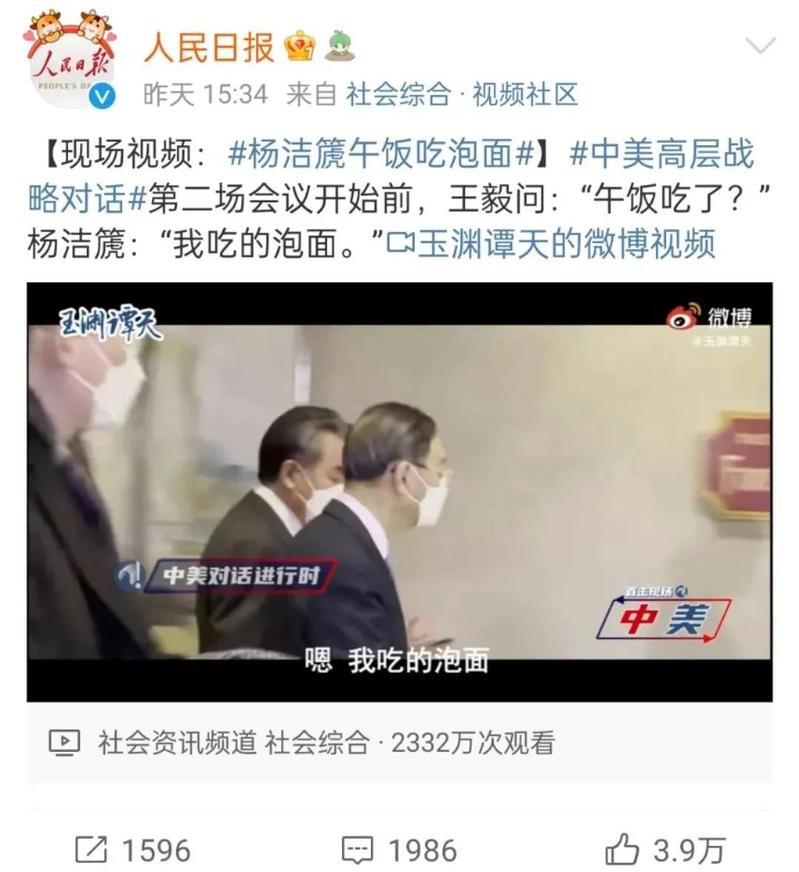 中美会谈间隙,发生了一处动人对话。外长王毅关心杨洁篪的午饭,杨洁篪回复:“我吃的泡面”。大量网友感慨,“中国有这样为国担当、坚守立场的外交官,人民敬佩且安心”。