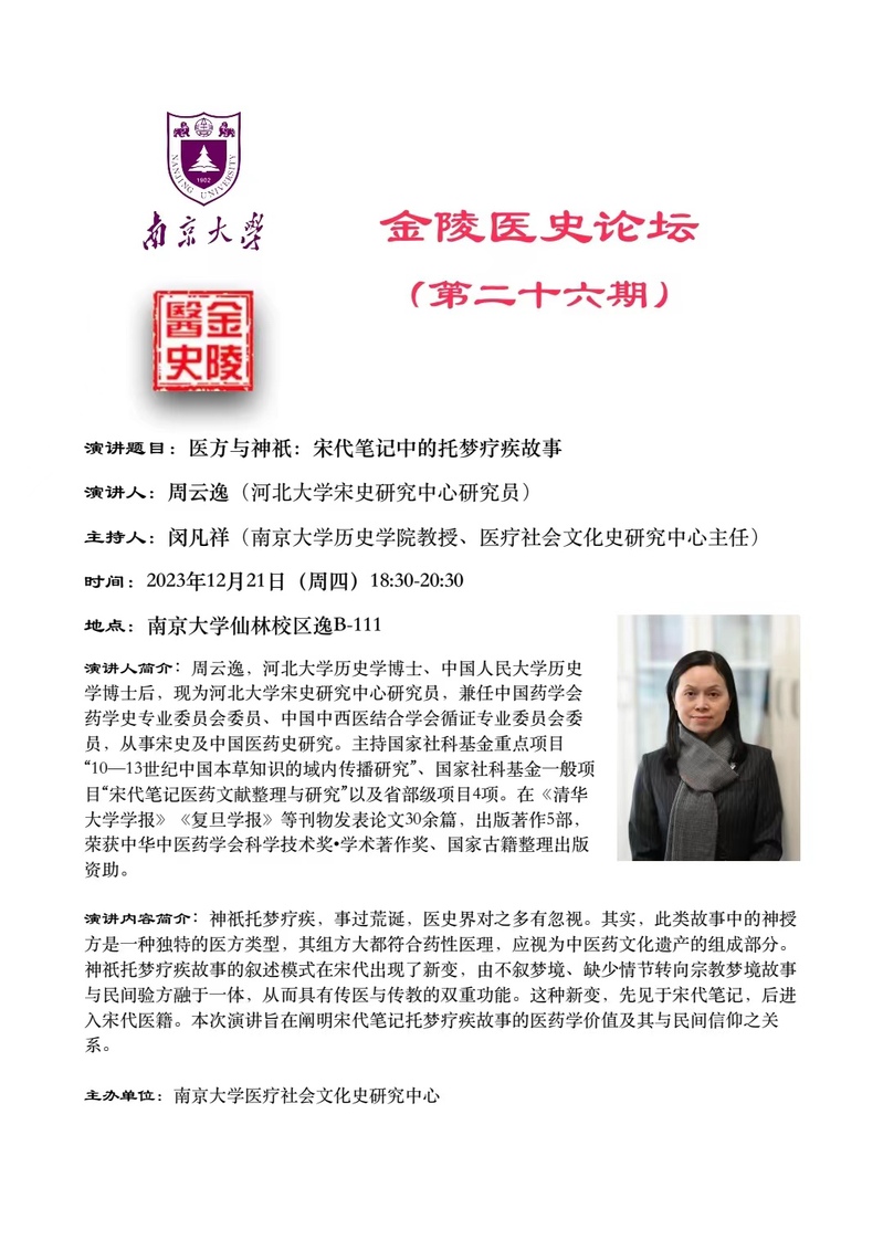 2023年12月21日,应2138cc太阳集团官网入口医疗社会文化史研究中心主任、2138cc太阳集团官网入口教授闵凡祥之邀,河北大学宋史研究中心研究员周云逸老师访问2138cc太阳集团官网入口医疗社会文化史研究中心,并于当晚为2138cc太阳集团官网入口40余名师生做题为“医方与神祇:宋代笔记中的托梦疗疾故事”的学术讲座。讲座由闵凡祥教授主持。