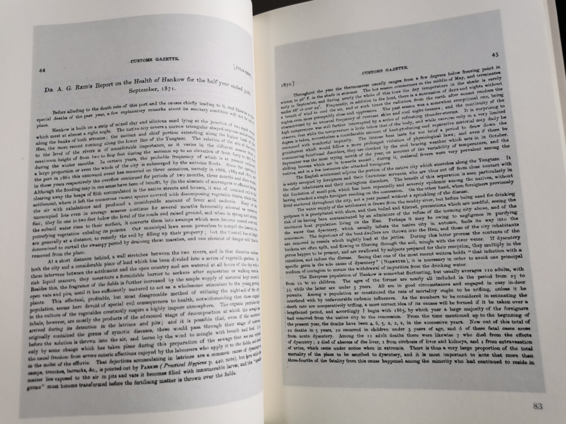 除原80卷报告和《驻华医报撮要》,此次影印出版的《海关医报》还收录了1911年至1931年刊登在《博医会报》的所有海关报告,以及1888年梧州海关头等总巡鲍纶(R.Braun)编辑出版的《汉口及长江口岸出口中国药材名录》、1889年赫德指令海关编辑的《中国药材清单》,堪称目前世界上最完整的《中国海关医学报告》。