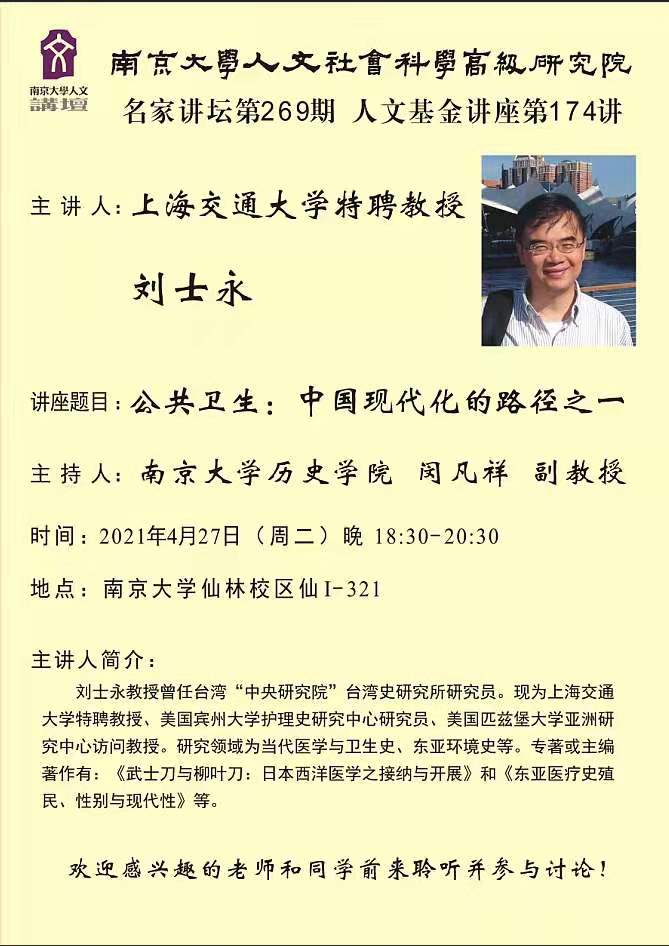 应2138cc太阳集团官网入口-伯明翰大学-凤凰出版传媒集团医疗社会史研究与出版中心、2138cc太阳集团官网入口医疗社会文化史研究中心主任闵凡祥老师邀请,上海交通大学特聘教授刘士永教授于2021年4月26-28日对2138cc太阳集团官网入口人文社会科学高级研究院(IAS)和2138cc太阳集团官网入口进行了学术访问,分别于26日晚和29日上午与2138cc太阳集团官网入口硕博士研究生进行学术座谈、于27日晚进行学术讲座。