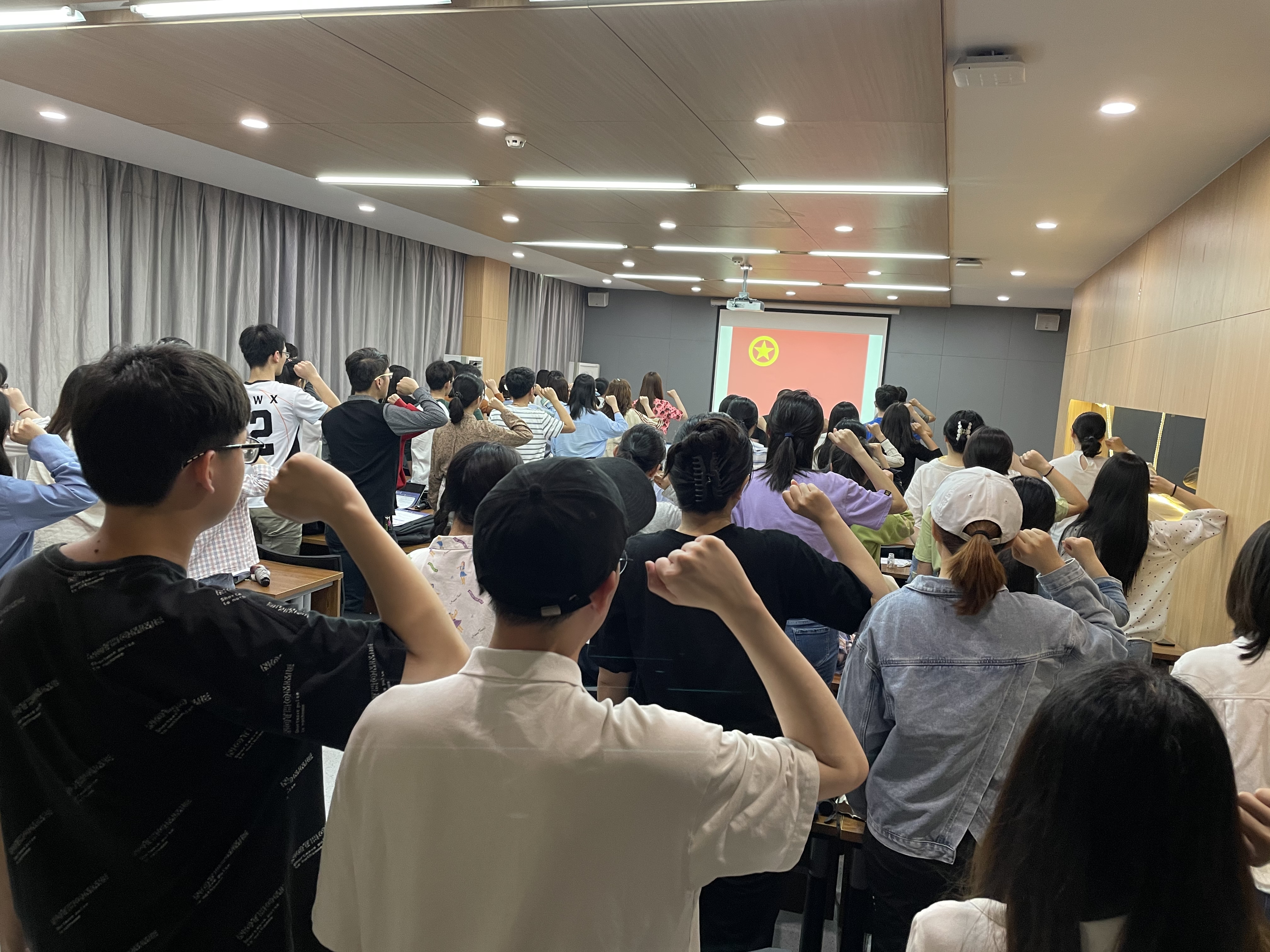 会议开始由团支部书记谈薇主持新团员入团仪式、老团员重温入团誓词。在团支部副书记常远的带领下,全体团员将右拳高举过肩,齐声宣誓,在神圣庄严的仪式感中凝聚共识,增强共青团员意识。