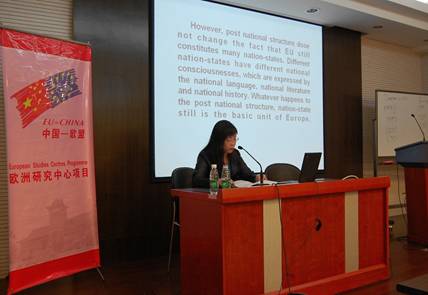 洪霞副教授发表演讲 最后发言的是历史系洪霞副教授,她的报告主题是“后民族时代的欧洲民族国家”(European Nation-States in the Post-national Era)。洪霞老师认为,虽然欧洲一体化的程度已经很深,欧洲仍然由许多民族国家组成,这一局面并没有被后民族时代所改变,民族国家仍然是欧洲的基本单位。哈贝马斯提出了公共领域(public sphere)的概念,在民族国家的建构中至关重要,欧洲层面上的公共领域能否产生还有待进一步考察。欧洲认同有两个方面,其一是多元,其二是同一,所谓 “求同存异”看似深奥,实际上揭示了欧洲文化认同的脆弱。与其将民族国家加以扬弃,不如进一步超越。 与会的除了发表讲话的专家,还有许多对欧盟研究深感兴趣的师生,他们在主题发言结束后与中海家家进行了深入而又热烈的交流。(历史系李超供稿)